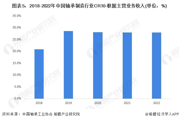 我国轴承制造行业企业数量较多,市场集中度不高。根据中国轴承工业协会公布的数据,2020年我国轴承行业的CR10为28.1%。2021年、2022年我国轴承行业的CR10在28.0%左右