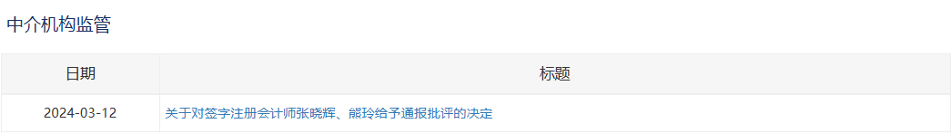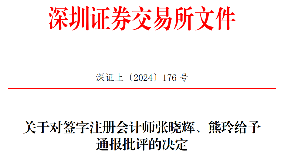 3月12日,深交所发布《关于对签字注册会计师张晓辉、熊玲给予通报批评的决定》。两人作为蓝盾信息安全技术股份有限公司2018年、2019年年度财务报表审计报告签字注册会计师,因出具的年度审计报告存在虚假记载,在审计过程中未勤勉尽责被深交所通报批评。