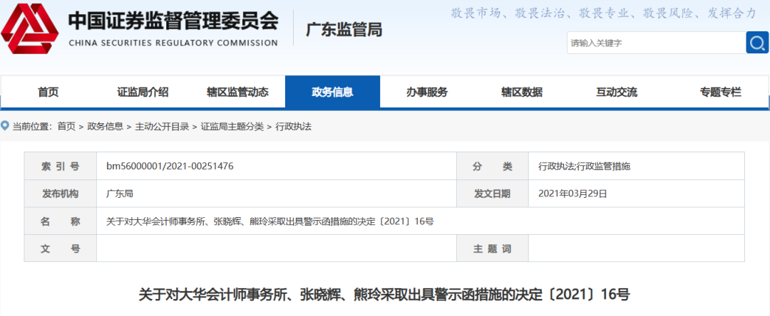 根据《上市公司信息披露管理办法》第六十五条的规定,我局决定对大华所和张晓辉、熊玲采取出具警示函的行政监管措施。你们应认真吸取教训,严格遵守相关法律法规和中国注册会计师审计准则的规定,进一步加强内部管理,健全质量控制制度。同时,大华所应对相关责任人进行内部问责,于收到本行政监管措施决定书30日内向我局报送整改报告、内部问责情况报告。