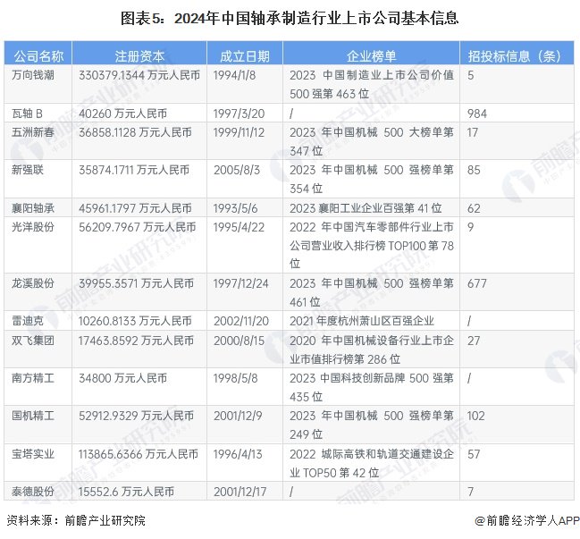 2、轴承制造行业上市公司基本信息对比