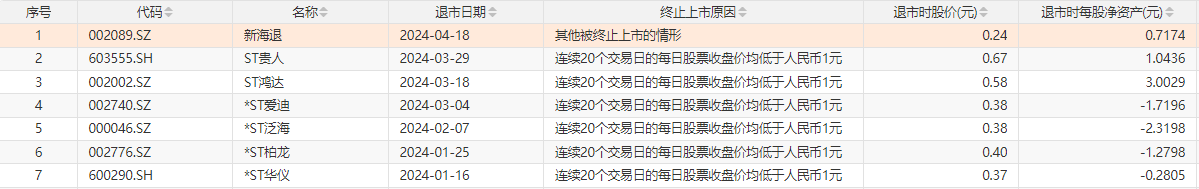 上证报中国证券网讯 4月18日,新海退正式退市。Choice数据统计,截至目前年内已有7只个股退市,其中6只个股因连续20个交易日收盘价低于1元而退市,包括*ST华仪、*ST柏龙、*ST泛海、*ST爱迪、ST鸿达、ST贵人。