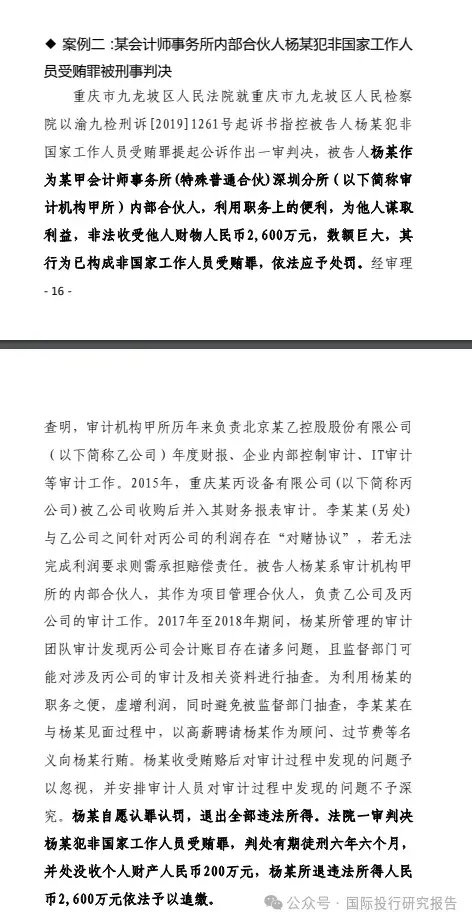 最新一期深圳证监局会计监督工作简讯(2024年第3期)披露了一则“一会计所内部合伙人因受贿罪被判六年六个月”的信息。