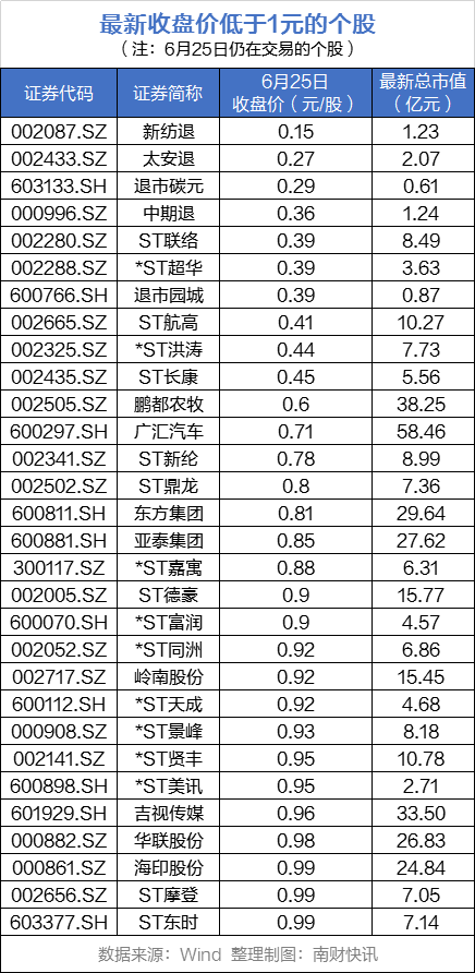 Wind数据显示,6月25日仍在交易的A股个股中,有30只当日收盘价低于1元。