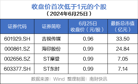 据南财快讯记者不完全统计,今日(6月25日),有4只A股首次出现交易日股票收盘价低于1元,分别为吉视传媒(601929.SH)、海印股份(000861.SZ)、ST摩登(002656.SZ)、ST东时(603377.SH)。