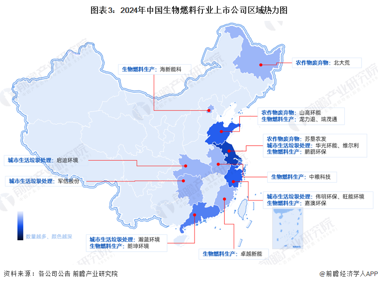 目前我国生物燃料上市公司主要分布在中部和东部沿海地区,西部地区企业数量较少。其中,江苏省生物燃料行业上市公司数量较多,分布在农作物废弃物、城市生活垃圾处理、生物燃料生产等各个环节。