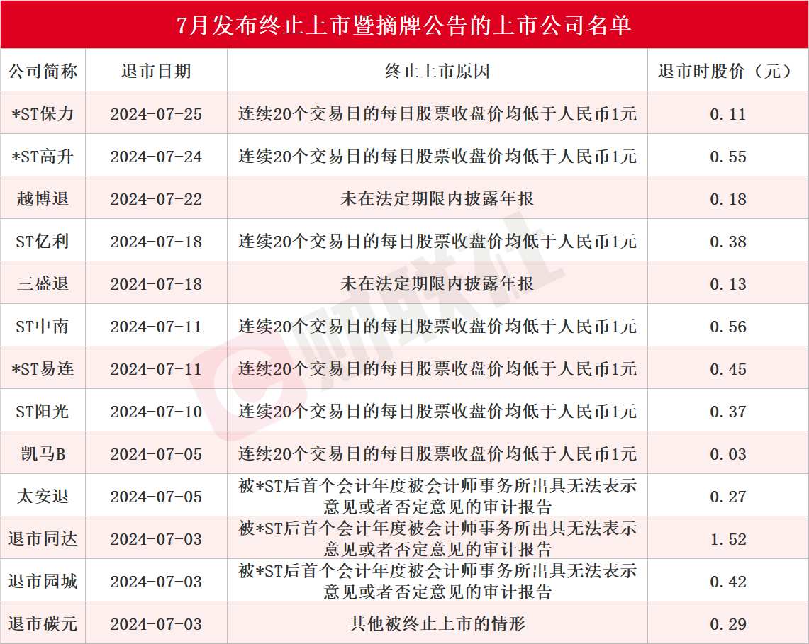 7月已有13家上市公司完成退市 10股收到终止上市事先告知书 *ST深天锁定A股市值退市第一股