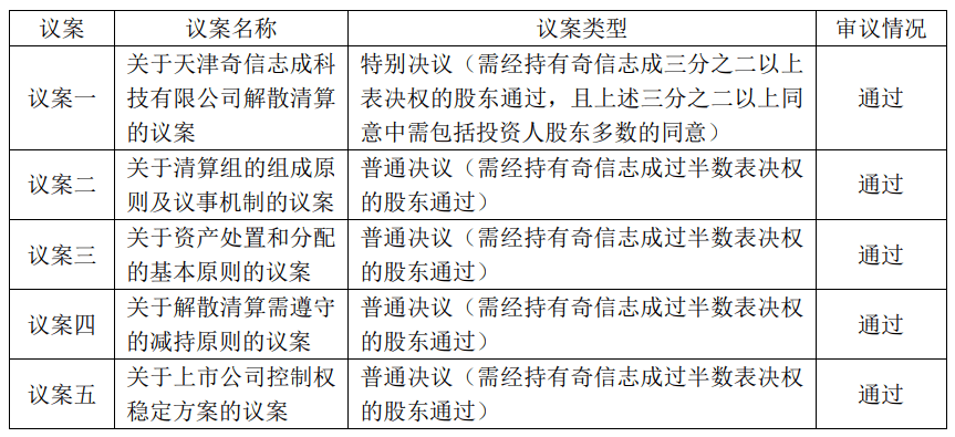 根据公告,此次奇信志成股东通过的议案包括5个,涉及奇信志成解散清算、资产分配、减持原则、360控制权稳定方案等。虽然周鸿祎均未投赞成票,但由于周鸿祎仅持有奇信志成17.38%的股权,这五项决议依然全部通过。