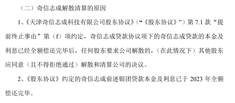 公告显示,奇信志成《股东协议》有关“提前终止事由”规定:奇信志成贷款协议项下的奇信志成贷款的本金及利息全额偿还完毕后,任何股东要求公司解散的,其他股东应同意(且不得拒绝通过)解散和清算公司的决议。奇信志成前述银团贷款本金及利息已于2023年全额偿还完毕,从而触发了解散清算的条件。