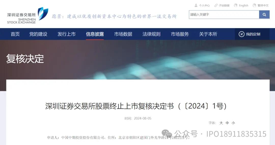 根据本所《理事会上诉复核委员会工作细则(2023年修订)》第二条的规定,本所作出以下复核决定:维持《关于中国中期投资股份有限公司股票终止上市的决定》(深证上〔2024〕419号)对中国中期投资股份有限公司作出的股票终止上市决定。