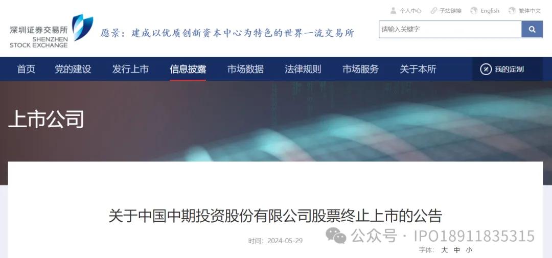 本所《关于中国中期投资股份有限公司股票终止上市的决定》(深证上〔2024〕419号)认定,2023年5月5日,因公司2022年度经审计的净利润为负值且营业收入低于1亿元,公司股票交易被实施退市风险警示。