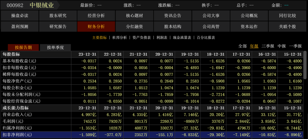 中银绒业2000年在深交所上市,起初以羊绒及制品经营为主,2019年启动破产重整跨界新能源。2015年至2023年的9年时间,有8年的扣非后净利润均亏损。