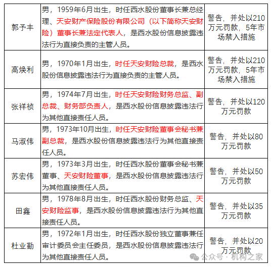 罚单显示,西水股份因未按规定披露重要合同、年报虚假记载等违法行为,被处以750万元的罚款,违法行为与旗下天安财险密切相关;此外,7位时任上市公司高管共被罚款725万元,其中6位在天安财险担任重要职位;同时,天安财险时任董事长郭予丰和总裁高焕利因情节严重,被采取5年市场禁入措施。特别引人注目的是,公告显示,时任总裁高焕利试图以精神病为由逃避处罚,这一荒谬的辩解在法律面前显得尤为滑稽和无力。