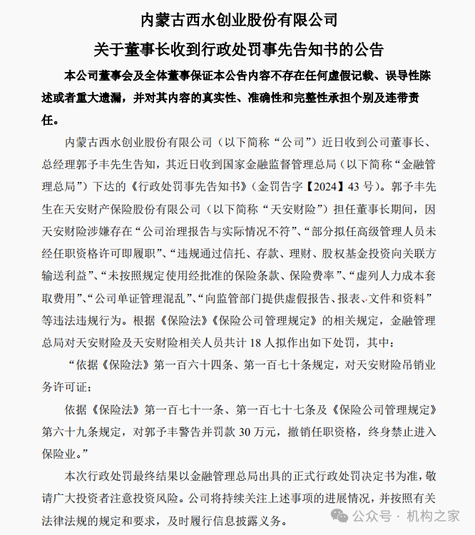 此次证监会的处罚决定,与金融监督管理总局的同步行动,共同织就了一张针对天安财险违规行为的天罗地网。6月底时,西水股份收到公司董事长、总经理郭予丰告知,其收到国家金融监督管理总局下达的《行政处罚事先告知书》(金罚告字【2024】43号)。