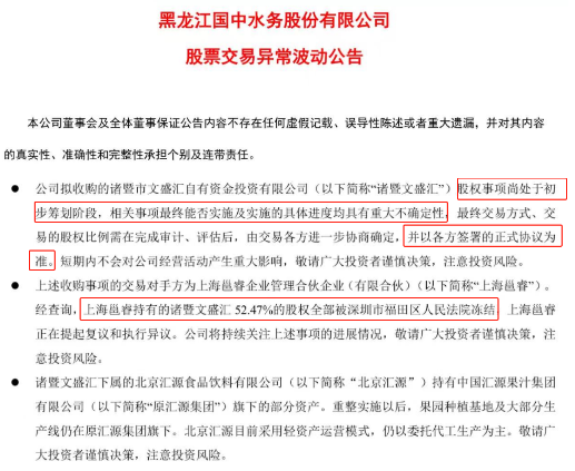 9月11日,黑龙江国中水务股份有限公司(SH600187后简称:国中水务)公告称,收购汇源果汁再生变数。