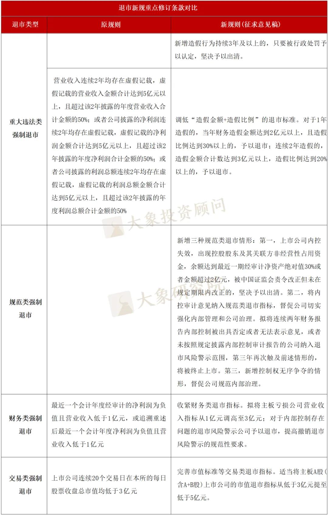 本次退市标准的修订在2020年退市改革的基础上进一步突出对财务造假、内控失效等乱象的打击力度,在2年连续造假强制退市指标基础上,新增1年造假、3年及以上连续造假的情形,并新增资金占用、内控非标审计意见、控制权无序争夺等三类规范类强制退市标准,坚决清除“害群之马”。