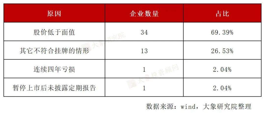 从这49家退市企业终止上市原因来看,34家因股价低于面值;13家因其它不符合挂牌的情形;1家连续三年亏损;1家因暂停上市后未披露定期报告。