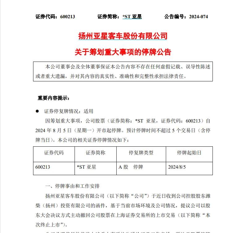 据*ST亚星公告,公司近日收到公司控股股东的函件,基于当前市场环境及公司情况,提议公司以股东大会决议方式主动撤回公司股票在上交所的上市交易。