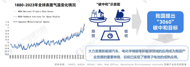 前瞻认为从工业时代开始,因人类活动而造成的温室气体排放量持续增加对气候产生了影响,气候变化所带来的极端天气等因素对人类的生存产生了极大的威胁。在此背景下,为抑制全球变暖,全球范围内“碳中和”概念被提出,我国进而提出“3060”碳中和目标,使得新能源汽车、电化学储能等新能源重点产业得到了大力发展,锂电池亦在该过程中得到了成熟应用。