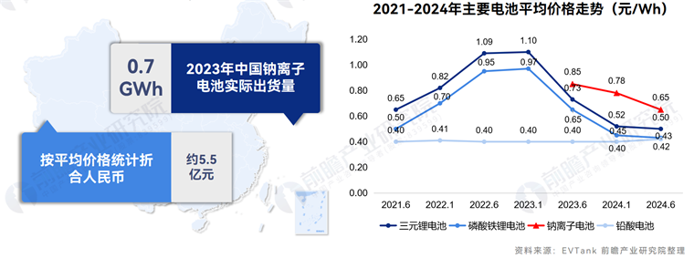 从中国市场来看,我国钠离子电池产业发展起步于地方项目,目前已进入全国统筹推进产业高质量发展的阶段,地方亦针对性出台政策深化布局钠电核心技术研发及应用。2023年中国钠离子电池实际出货量为0.7GWh,尚未步入规模化发展阶段。结合中国主要电池平均价格的走势来看,尽管钠离子电池在潜在生产成本上有所优势,但规模化效应尚未形成等因素,导致钠离子电池在销售渠道中价格优势并不明显,总体来看,我国钠离子电池商业化发展路径亟待进一步探索。