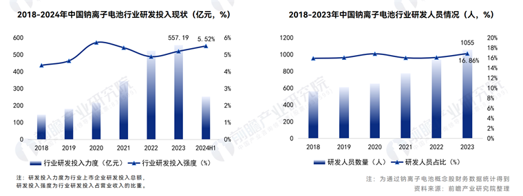 据前瞻研究,钠离子电池的技术一直在不断投入。2018-2023年期间,中国钠离子电池行业相关厂商研发投入规模呈逐年增长的趋势,并保持较高增速;研发投入强度呈波动增长趋势,2023年,中国钠离子电池行业研发投入规模达557.19亿元。研发人员方面,2023年,中国钠离子电池行业相关上市企业平均研发团队规模达到1055人,表明中国钠离子电池行业研发团队规模正进一步壮大。