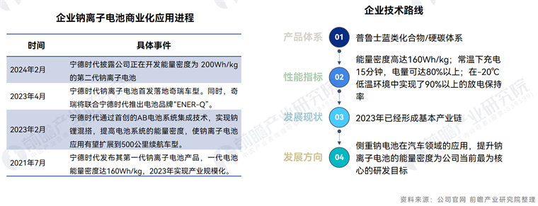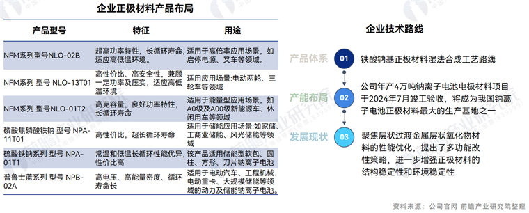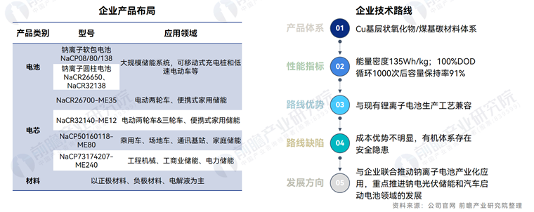 Ø 钠创新能源则侧重于钠离子电池材料的研发与生产,公司的正极材料及其电解液已经在宁德时代、比亚迪、中兴派能、南都电源、猛狮科技、捷威动力、维科技术、超威科技、天能电池等20多家电池制造企业进行验证,公司的圆柱型、软包型钠离子电池的性能已经达到家用储能、微型电动车、移动基站应用要求。