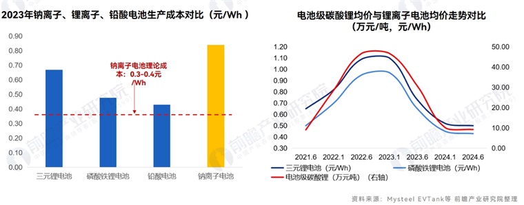 前瞻研究团队通过分析得出,钠离子电池要想取代或平行锂离子电池发展,当前钠电生产成本与理论成本仍存巨大差距,尽管钠离子电池的原材料成本相对较低,但目前钠离子电池理论成本优势尚未体现出来,出货量及产业化发展不及预期。当电池级碳酸锂价格在20元/Wh以下时,钠离子电池目前的平均生产成本仍在三元锂离子电池、磷酸铁锂电池和铅酸电池等竞品之上,但这并不代表未来没有可能。