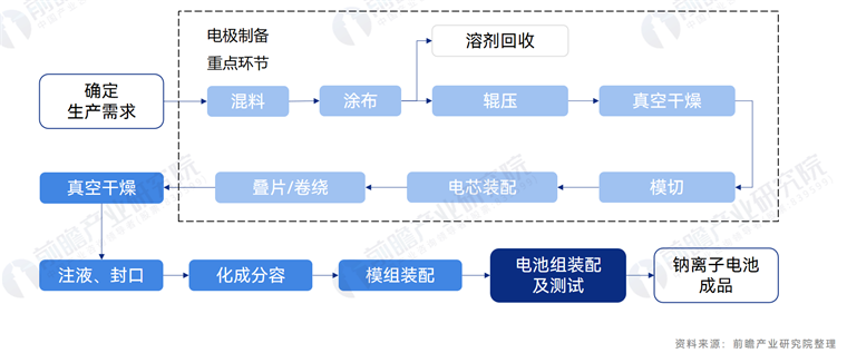 在考虑钠离子电池量产的同时,技术突破与市场需求结合是重要的衡量指标,前瞻团队通过研究观察发现,钠离子电池整体工艺流程与锂电池类似,总体分为原材料制备、电极制备、电池装配、成品检测等步骤,其中电极制备为钠离子电池生产工艺流程的重点,涉及生产工艺中的多个核心环节。