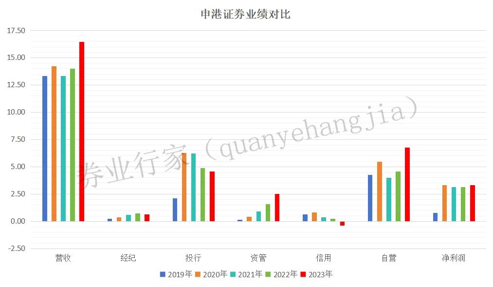 2023年,申港证券营业收入16.44亿元,同比增长17.43%;净利润3.33亿元,同比增长5.70%。第一大业务自营业务揽收6.74亿元,同比增长48.15%;主要来自投资收益的扩增。投行业务收入4.59亿元,同比下降6.32%。