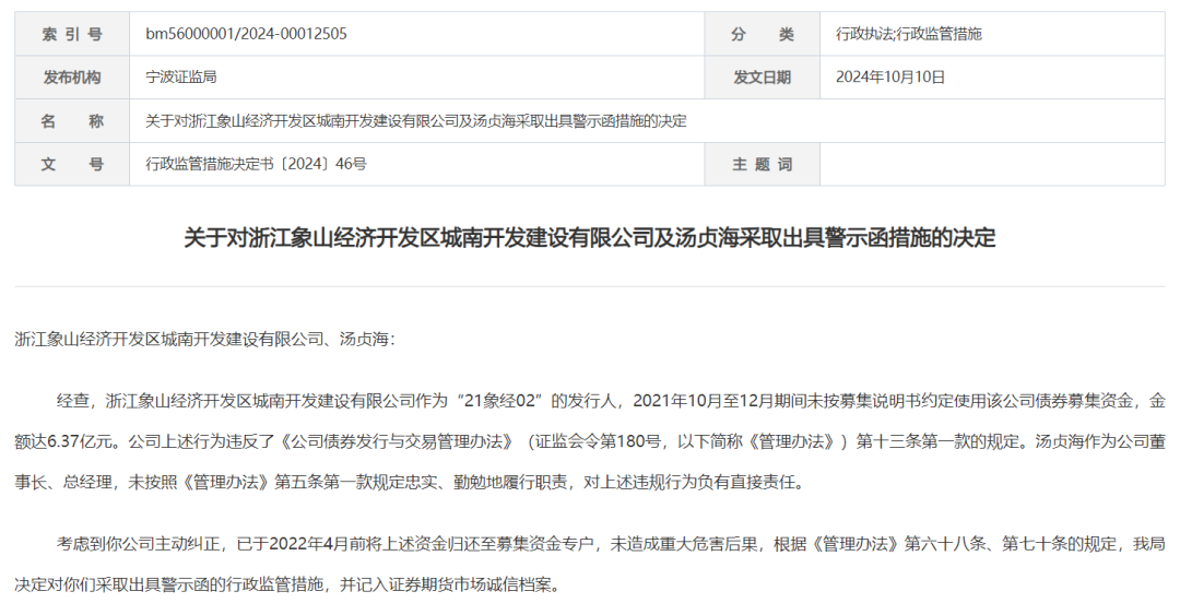 监管函显示,浙江象山经济开发区城南开发建设有限公司(简称:象山经开)作为“21象经02”的发行人,2021年10月至12月期间未按募集说明书约定使用募集资金,金额达6.37亿元。汤贞海作为象山经开董事长、总经理,未按相关规定忠实、勤勉地履行职责,负有直接责任。