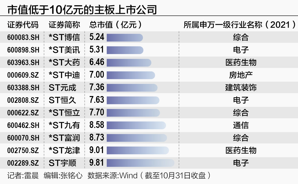 值得注意的是,市值低于10亿元的主板上市公司,均为ST类股票,包括*ST博信(维权)、*ST美讯(维权)、*ST大药、*ST中迪(维权)、ST元成(维权)、ST恒久(维权)、*ST恒立(维权)、*ST九有、*ST富润(维权)、*ST龙津和ST宇顺。