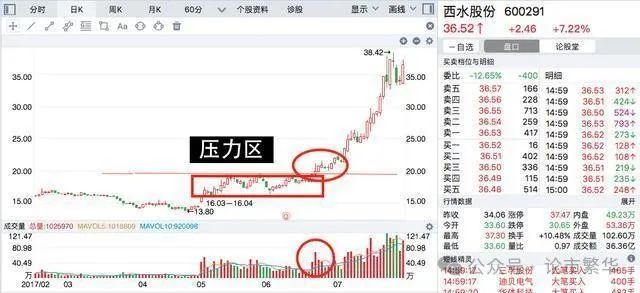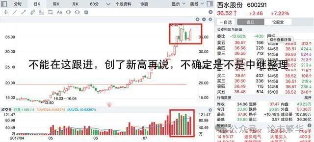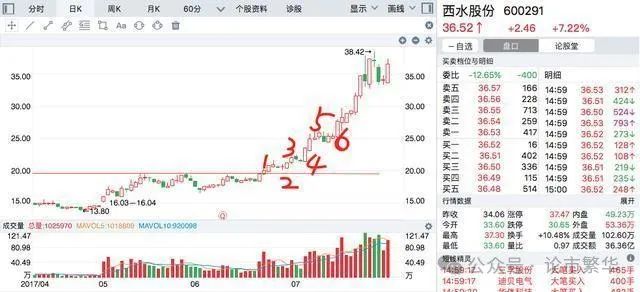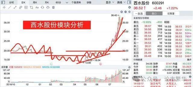 今天拿西水股份这只股票讲一下,西水股份在保险板块里面在去年的四月份之前都属于弱势的品种,它不属于强势股票这个概念里面,也就没有进入我们的视野,但是从五月份之后就不一样了,保险里面只有中国平安比西水股份强,其他的都不如它强势。我们说市场唯一不变的就是变化,你要做的就是顺应这个变化。下面这个图是把西水股份的走势用教学模块的方式画出来方便大家理解。