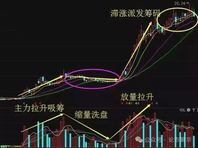 牛股后期:连续的拉升之后高位出现巨量之后呈现量缩价跌,说明主力逐渐派发,也有新资金不断在高位接盘,股价出现滞涨的横盘震荡。