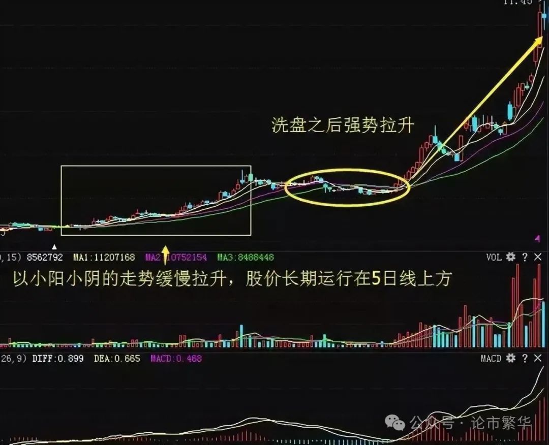 行情的大小,可从主力拉升的方式来预测,一般说来,主力最佳的拉升方式是:以小阳小阴的走势缓慢拉升,股价长期运行在MA5上方,主力在缓慢拉升中完成建仓,此类个股主力上涨目标高,经过洗盘之后,后市涨幅喜人。