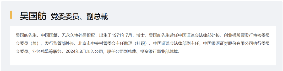 值得注意的是,此时距离吴国舫正式加入国信证券尚不足八个月。2024年3月,吴国舫加入国信证券,并于今年4月被委任为公司副总裁、投资银行事业部总裁。