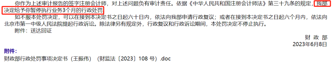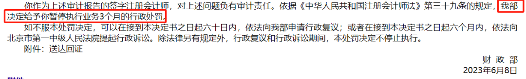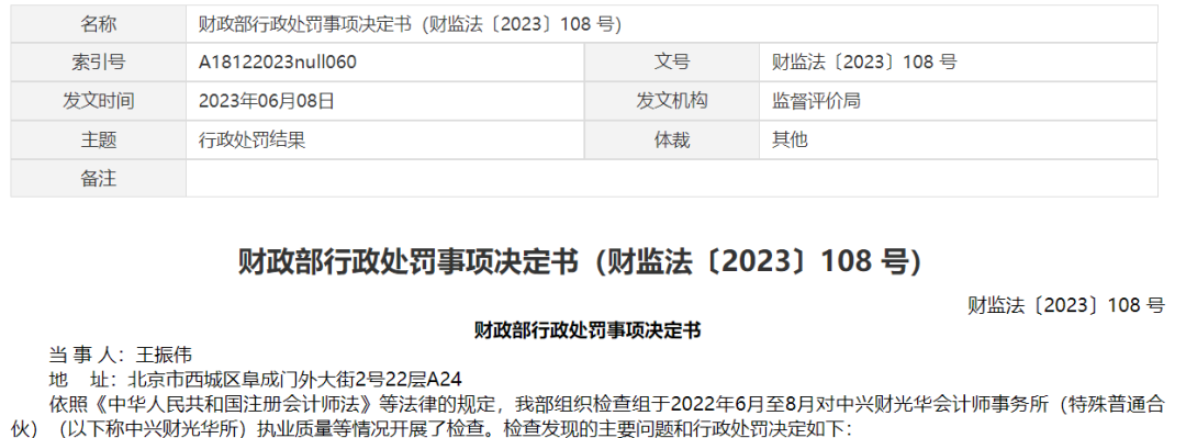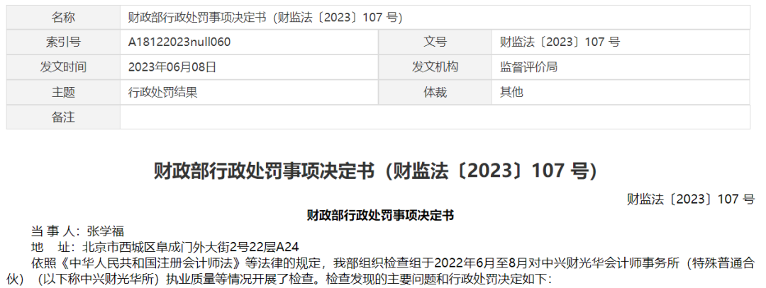 2023年6月13日,财政部公布了对中兴财光华所和2名注册会计师的处罚决定,中兴财光华会计所被警告、没收违法所得220万元并处罚款440万元;两名注册会计师被暂停执行业务3个月。
