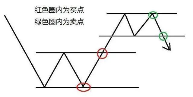 12、综合来看,正确的买卖选择如下图所示,红色点为正确的买点,绿色点为卖点或者减仓点,此图包含了个股从底部-拉升-顶部-下跌的四个过程。