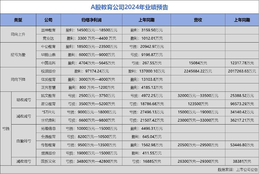 从A股教育上市公司发布2024年业绩预告看,17家公司在业绩大幅波动的背景下呈现严重的分化。