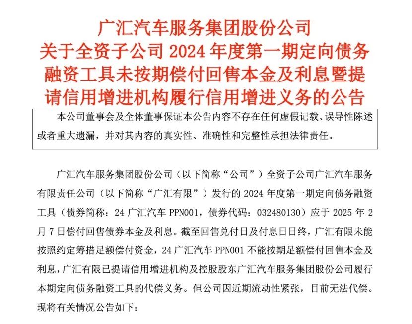 2月8日,广汇汽车服务集团股份公司(以下简称“广汇汽车”)公告称,其全资子公司广汇汽车服务有限责任公司(以下简称“广汇有限”)发行的“24广汇汽车PPN001”未能按期足额偿付回售本金及利息,构成违约。