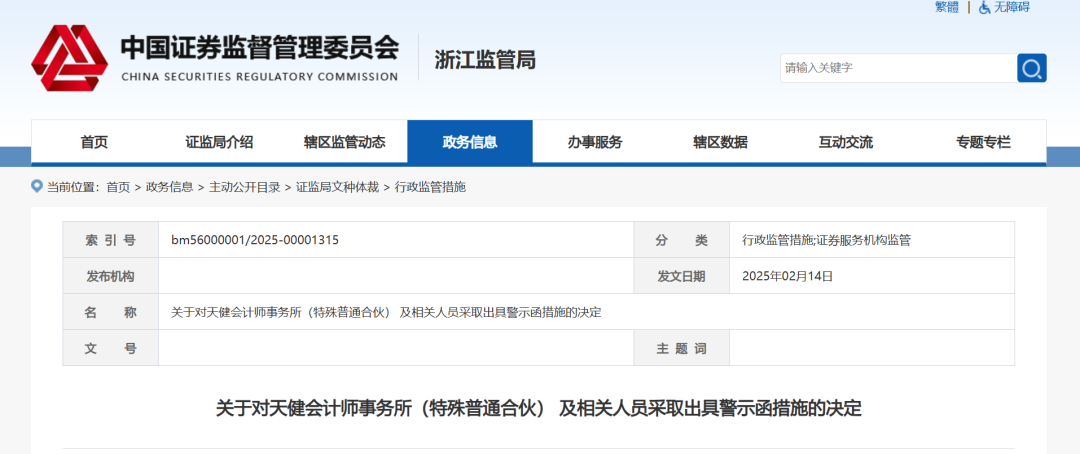 天健会计师事务所(以下简称“天健所”)作为国内头部审计机构,近年来因多起审计项目执业质量问题频遭监管处罚。此次浙江证监局于2025年1月17日发布的警示函,主要针对天健所在内部治理、质量控制体系、独立性管理及多个审计项目执业中的系统性缺陷,涉及25名签字注册会计师,问题覆盖范围广、处罚力度严,反映出其合规性与专业性的严重不足。
