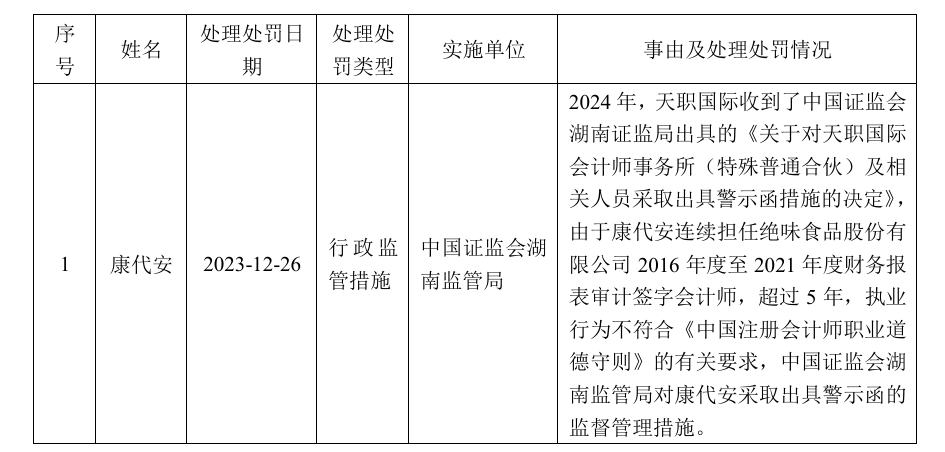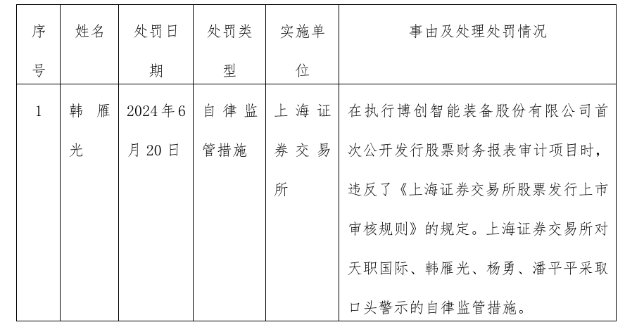 2024年,天职国际收到了中国证监会湖南证监局出具的《关于对天职国际会计师事务所(特殊普通合伙)及相关人员采取出具警示函措施的决定》,指出天职国际在执行道道全粮油股份有限公司、大唐华银电力股份有限公司2022年报审计项目时,执业行为不符合《中国注册会计师职业道局