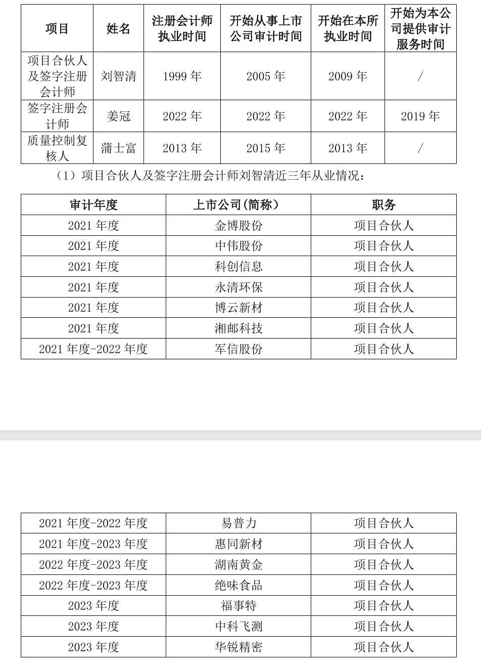 项目合伙人及签字注册会计师 1:傅成钢,1998年成为注册会计师,2008年开始从事上市公司审计,2010年开始在天职国际执业,2023年开始为本公司提供审计服务,近三年签署上市公司审计报告不少于10家,近三年复核上市公司审计报告不少于3家。