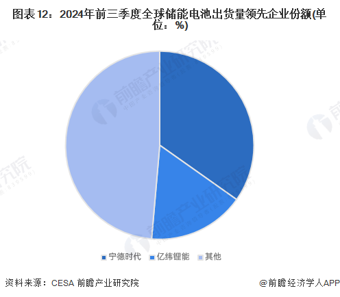 据CESA储能应用分会产业数据库不完全统计,2024年前三季度全球储能电池出货量超215GWh,其中全球储能电池出货量前九名均为中国企业,中国企业储能电池出货量超200GWh,全球市场占有率超过93%。其中,宁德时代储能电池出货量约75GWh,全球市场占有率34.80%,居全球第一。