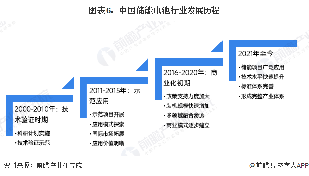 我国储能电池市场大致可分为四个发展阶段:一是技术验证阶段(2000-2010年),主要是开展基础研发和技术验证示范;二是示范应用阶段(2011-2015年),通过示范项目开展,储能技术性能快速提升、应用模式不断清晰,应用价值被广泛认可;三是商业化初期(2016-2020年),随着政策支持力度加大、市场机制逐渐理顺、多领域融合渗透,储能装机规模快速增加、商业模式逐渐建立;四是产业规模化发展阶段(2021-2025年),储能项目广泛应用、技术水平快速提升、标准体系日趋完善,形成较为完整的产业体系和一批有国际竞争力的市场主体,储能成为能源领域经济新增长点。