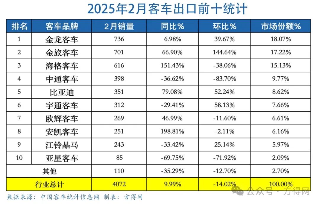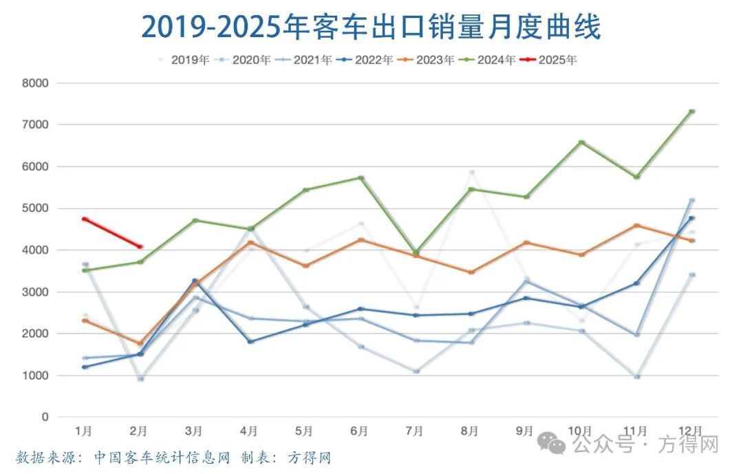 2025年2月客车出口4072辆,创造7年来2月出口最好成绩!