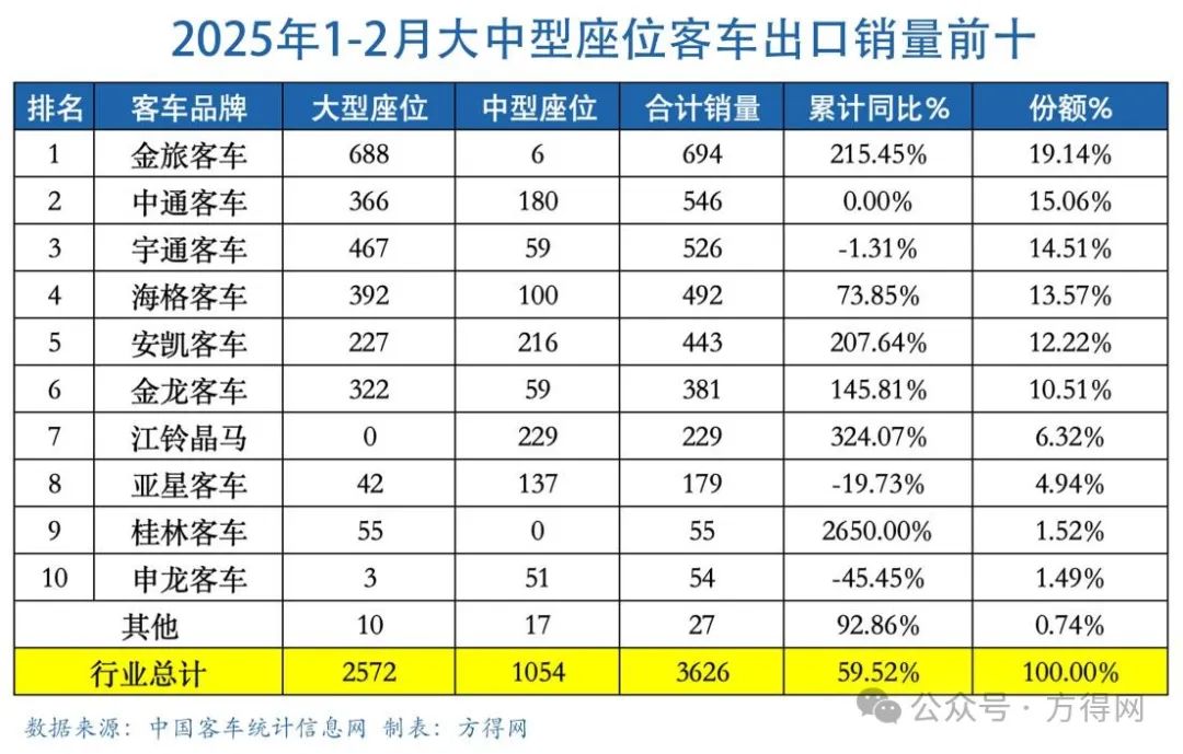 在传统客车主导的大中型座位客车领域,2025年1-2月出口3626辆、同比大涨59.52%。