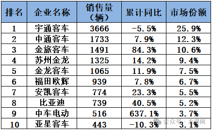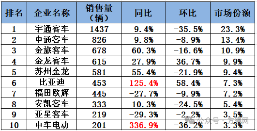 从月度销量排行来看,在销量前十企业中,金旅客车、苏州金龙、比亚迪、中车电动,四家企业增速超五成,其中,同比增幅最高的是中车电动(增长336.9%)。