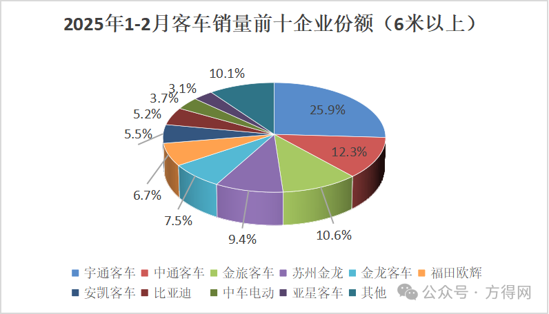 从市场份额来看,2025年1-2月前十企业占据了89.9%的市场份额,前五企业市场份额为65.7%,后五企业为24.2%。前十企业中,有三家企业市场份额占据较高,其中,宇通客车以25.9%的市场份额,继续保持了其市场领先地位,中通客车、金旅客车两家企业分别占据12.3%、10.3%的市场份额。