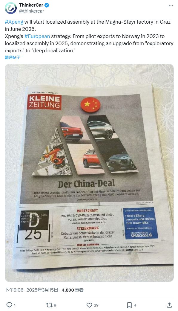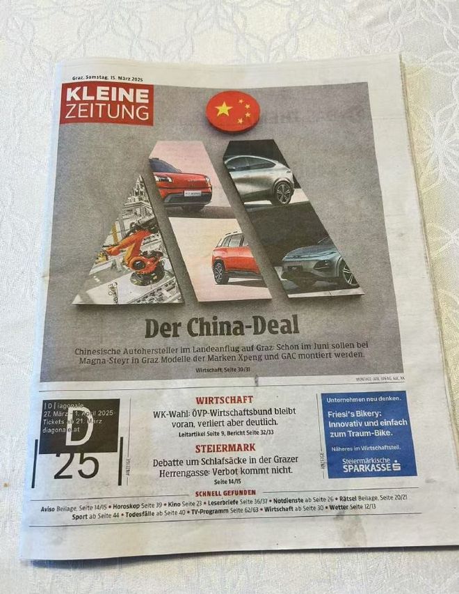 IT之家 3 月 17 日消息,德国媒体《克莱恩报》3 月 15 日称,小鹏、广汽将从 6 月开始在奥地利格拉茨的麦格纳斯太尔(Magna Steyr)工厂进行生产,初期阶段只有SKD 半散件方式组装的特殊车型。