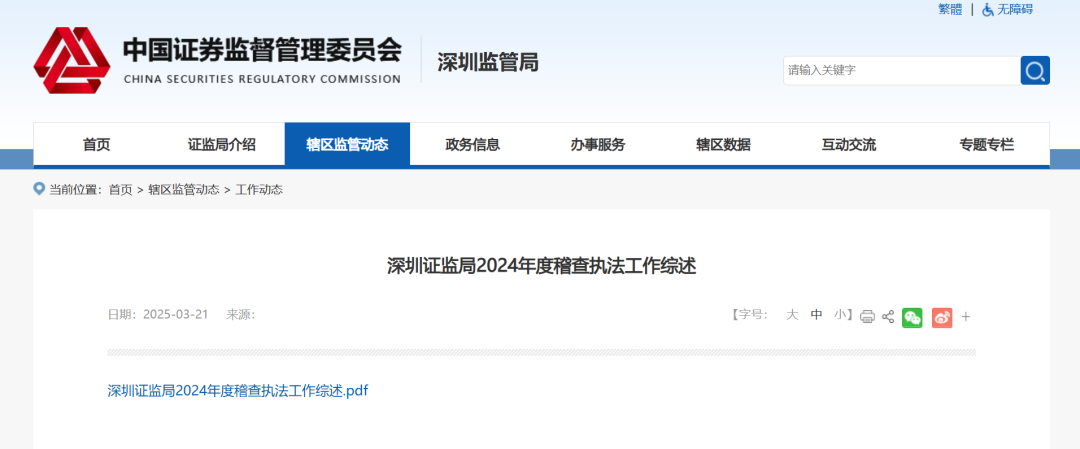 2024 年,在中国证监会党委的坚强领导下,深圳证监局坚持以习近平新时代中国特色社会主义思想为指导,认真学习贯彻党的二十大和二十届二中、三中全会以及中央金融工作会议精神,突出强本强基、严监严管,深入落实两办《意见》和新“国九条”工作部署,围绕“防风险、强监管、促进高质量发展”中心工作,聚焦重大案件办理,坚持“零容忍”工作方针,持续提升稽查执法效能和投资者保护水平。