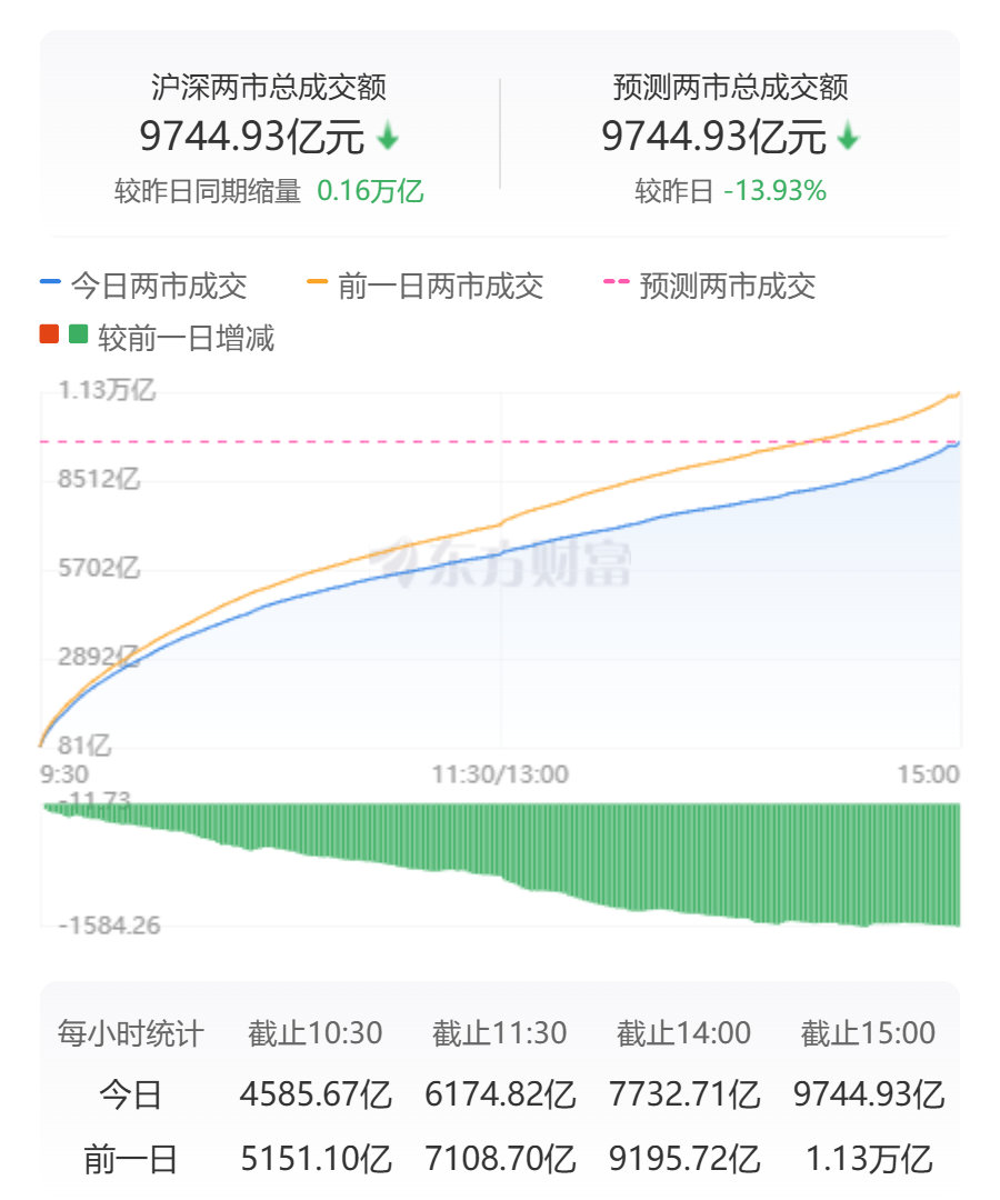 A股三大指数今日震荡整理,截止收盘,沪指涨0.05%,收报3350.13点;深证成指涨0.09%,收报10513.12点;创业板指涨0.13%,收报2104.63点。沪深两市成交额时隔50个交易日后再度跌破一万亿,今日仅有9745亿,创出年内成交额次低,较昨日缩量1578亿。